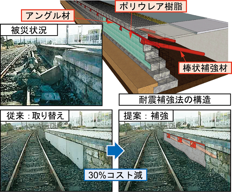 過去の地震において、組積盛土式ホームを構成する組積壁が転倒または傾斜する被害が多く発生しており、これらの被害を防止する耐震補強法が求められています。従来の耐震補強ではホームの取り替えが必要なため、高コストとなっていました。