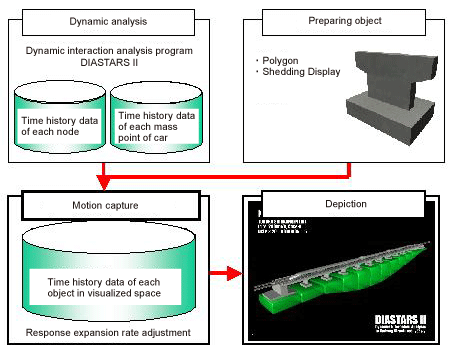 During numerical analysis, the time history data constantly increases in tiny time increments, so that it is often difficult to get a bird's eye view of all analysis results in order to correctly understand the phenomenon. Therefore, RTRI has constructed a visualization system using existing CG technology.
